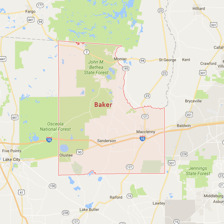 Baker County is a county located in the U.S. state of Florida. As of the 2010 census, the population was 27,115. Its county seat is Macclenny, Florida. Wikipedia