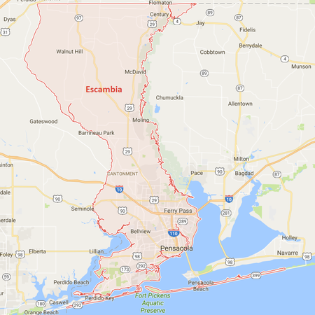 Escambia County is the westernmost county in the U.S. state of Florida. As of the 2010 census, the population was 297,619. Its county seat is Pensacola and the County Administrator is Jack Brown. Wikipedia