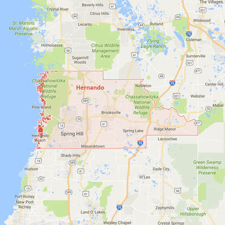 Hernando County is a county located in the U.S. state of Florida. As of the 2010 census, the population was 172,778. Its county seat is Brooksville, and its largest community is Spring Hill. Wikipedia