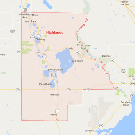 Highlands County is a county located in the U.S. state of Florida. As of the 2010 census, the population was 98,786. Its county seat is Sebring. Highlands County comprises the Sebring, FL Metropolitan Statistical Area. Wikipedia