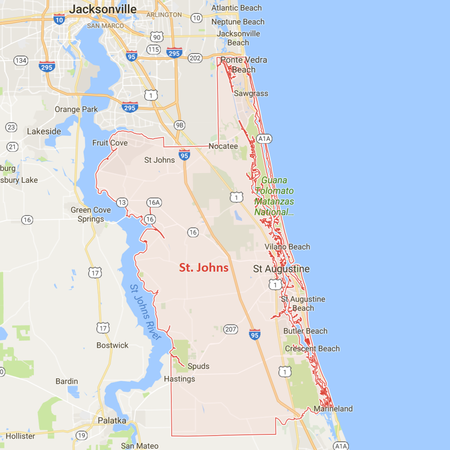 St. Johns County is a county of the U.S. state of Florida. As of the 2010 United States Census, the county's population was 190,039. The county seat and largest incorporated city is St. Augustine. The county was established in 1821. Wikipedia