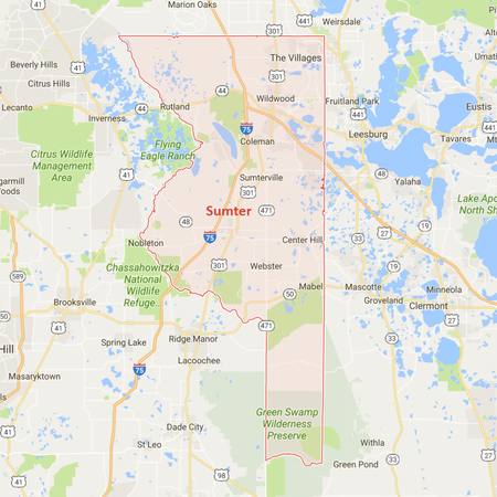 Sumter County is a county located in the state of Florida, United States. As of the 2010 census, the population is 93,420, and it has the oldest median age of any US county. Its county seat is Bushnell, and the largest community is The Villages. Wikipedia