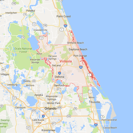 Volusia County is located in the east-central part of the U.S. state of Florida, stretching between the St. Johns River and the Atlantic Ocean. As of the 2010 census, the county was home to 494,593 people, an increase of 11.6% from 2000. Wikipedia