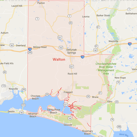 Walton County is a county located in the state of Florida. As of the 2010 census, the population was 55,043. Its county seat is DeFuniak Springs. The county is home to the highest natural point in Florida: Britton Hill, at 345 feet. Wikipedia